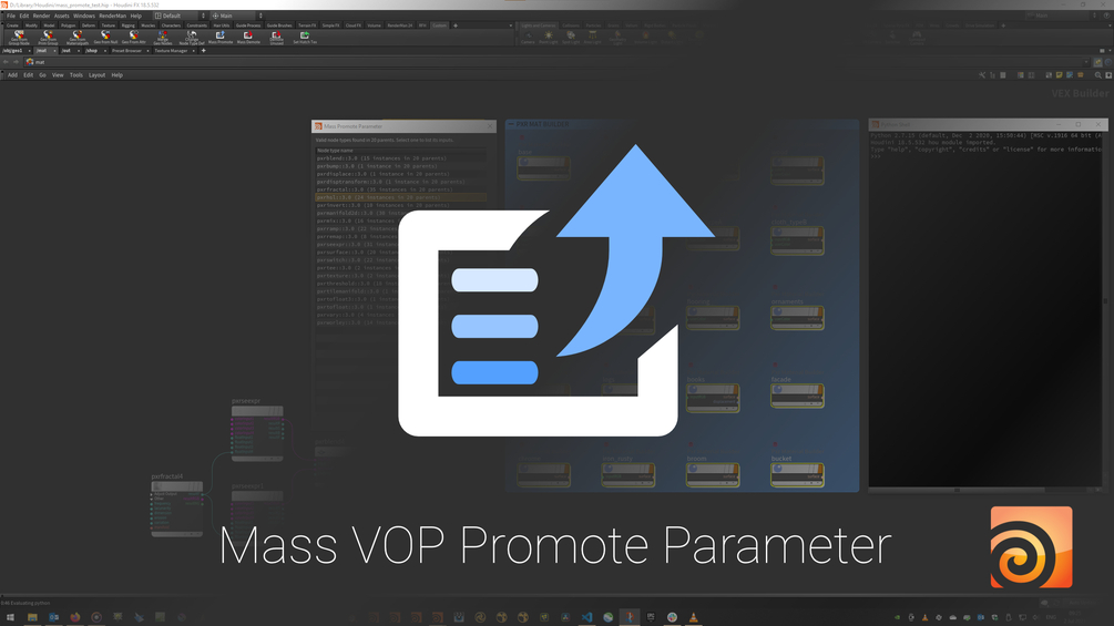 This shelf tool can promote parameters from VOP nodes in bulk. A great example of that can be shading networks. Speeding up my shading workflow was the primary motivation to write it.